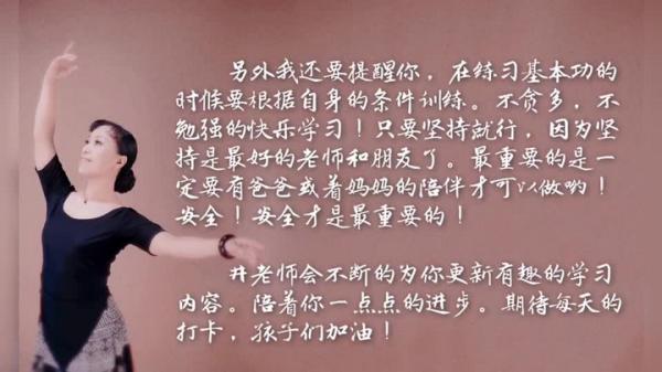 另外我还要提醒你,在练习基本功的时候要根据自身的条件训练。不贪多,不勉强的快乐学习!只要坚持就行,因为坚持是最好的老师和朋友了。最重要的是一定要有爸爸或着妈妈的陪伴才可以做哟!安全!安全才是最重要的!