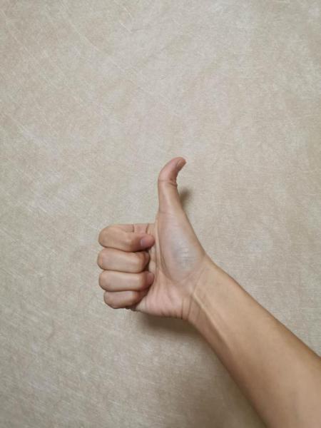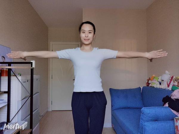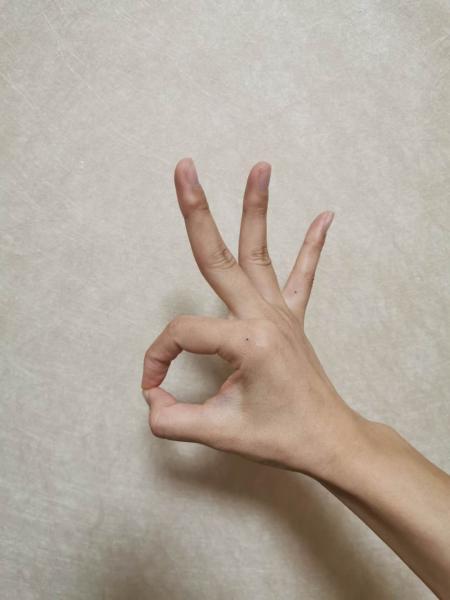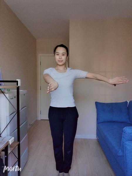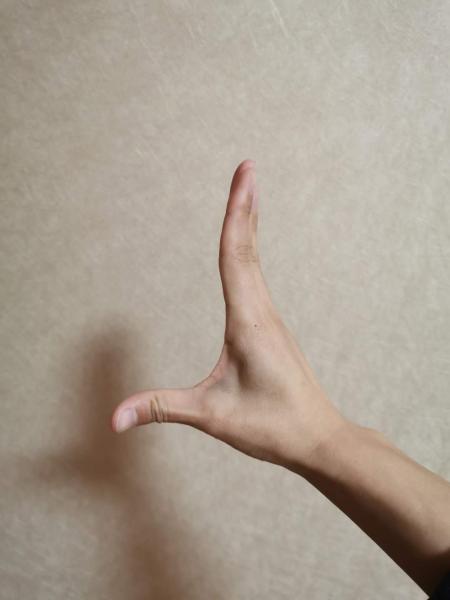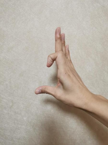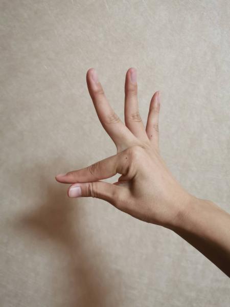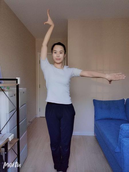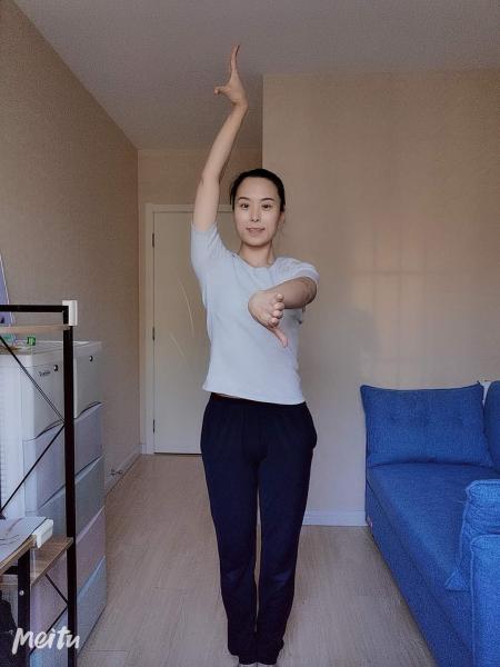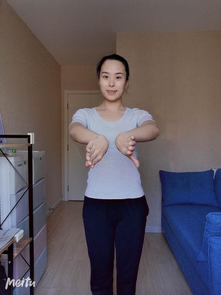 七位手:双手向两边打开,手背对前方,胳膊肘和手腕的弯曲不变。