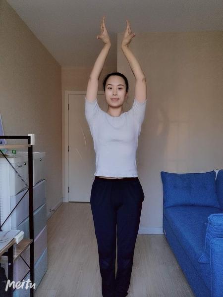 三位手:在二位的基础上,置于头顶,注意肩膀放松,手腕相对,靠拢。