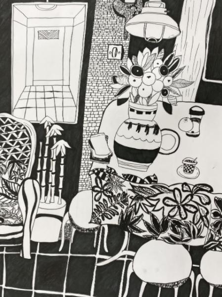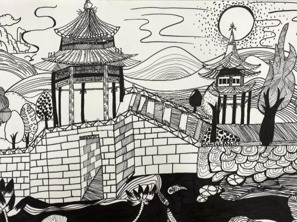 线描,就是用线条画画,是绘画的基础,通过线的运用和表现,运用线的疏密、是非、曲直排列变化,来表现黑白关系。常用到的有垂直线、水平线、斜线、折线、交叉线、弧线、波浪线、螺旋线等。线作为面与面的接壤或物象边沿的绘画线条,是人类观察世界、对话世界的直觉符号,可以捉住儿童善于幻想的心理,培养儿童的观察力和创造力,同时锻炼控笔能力。
